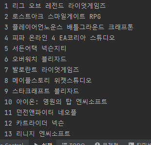 소스코드 정제가 완료되면 이제 필요한 부분만 골라오는 작업을 하면 되는데 우리가 이 페이지에서 필요한 정보는 게임랭킹, 게임 타이틀, 제조사 정도다.