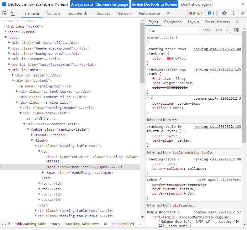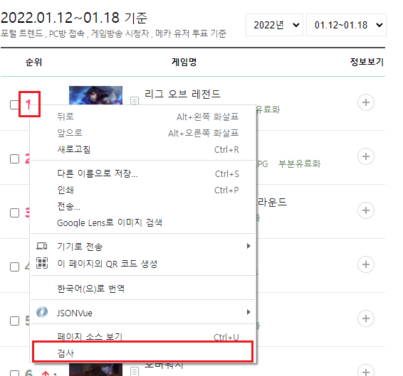 위 페이지에서 순위들 중 하나 위에 커서를 두고 우클릭을 한 후 [검사]를 클릭한다.
