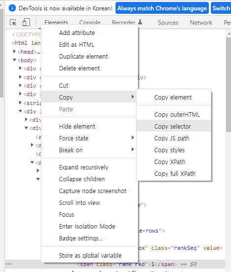 이후 해당 코드에 커서를 두고 마우스 우클릭 후 [Copy] - [Copy selector]를 클릭한다.